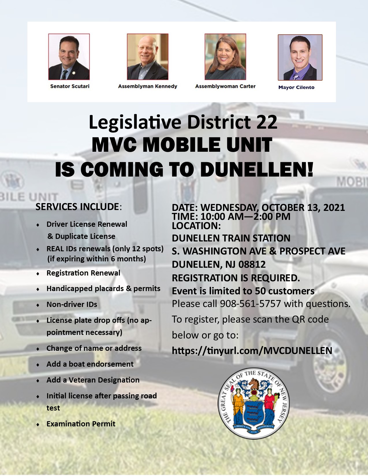 The new jersey motor vehicle commission mobile unit will be available at the following locations with appointments for real ids and registration renewals.